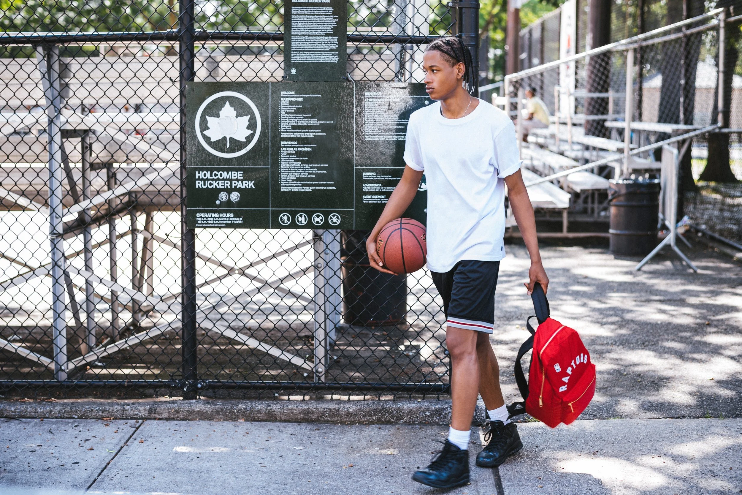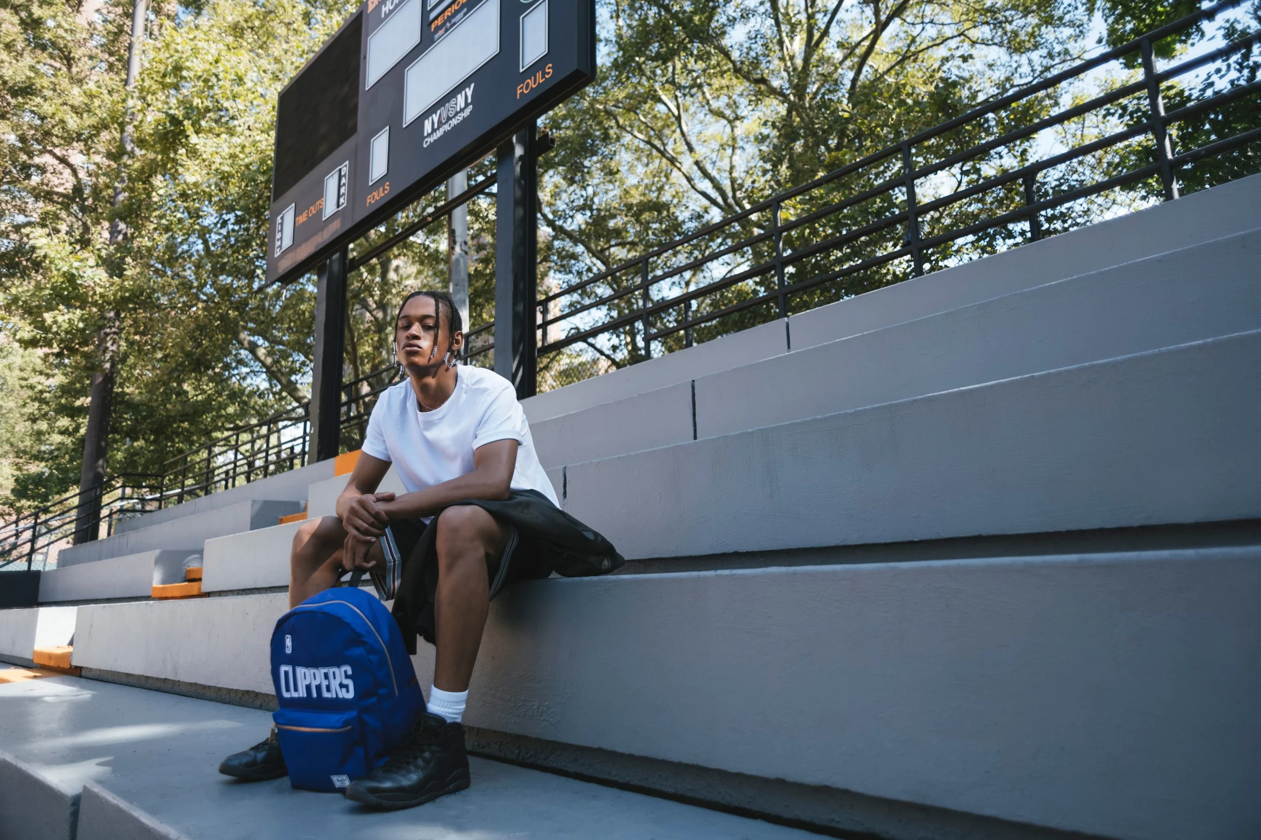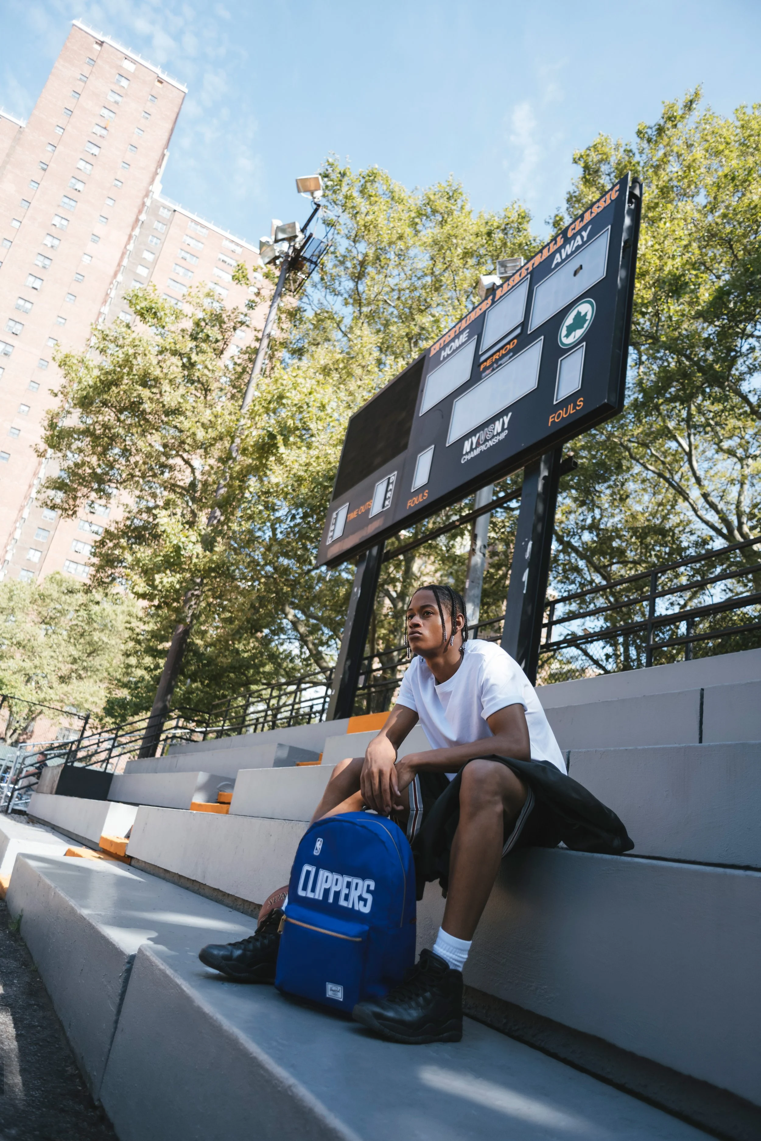 Featuring vintage-inspired fabrics and team logos, the designs blend nostalgic charm with modern utility. Shot at Rucker Park in Harlem — an iconic home of street basketball — the campaign captures the energy and spirit of the game in its purest form.